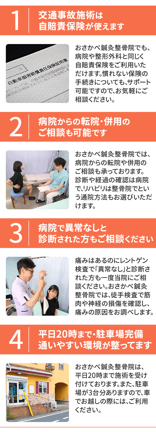 当院では、患者様の早期回復を最優先としながら、保険会社様との信頼関係構築も大切にしております。不明瞭な請求や過剰な施術を避け、透明性のある対応を心がけることで、三者すべてにとって納得できる関係づくりを目指しています。