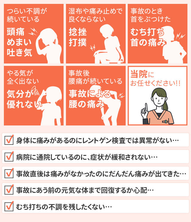 A. まずは当院にお電話ください。事故の状況は一つとして同じものがないため、お話を伺った上で最適な初動対応をアドバイスいたします。