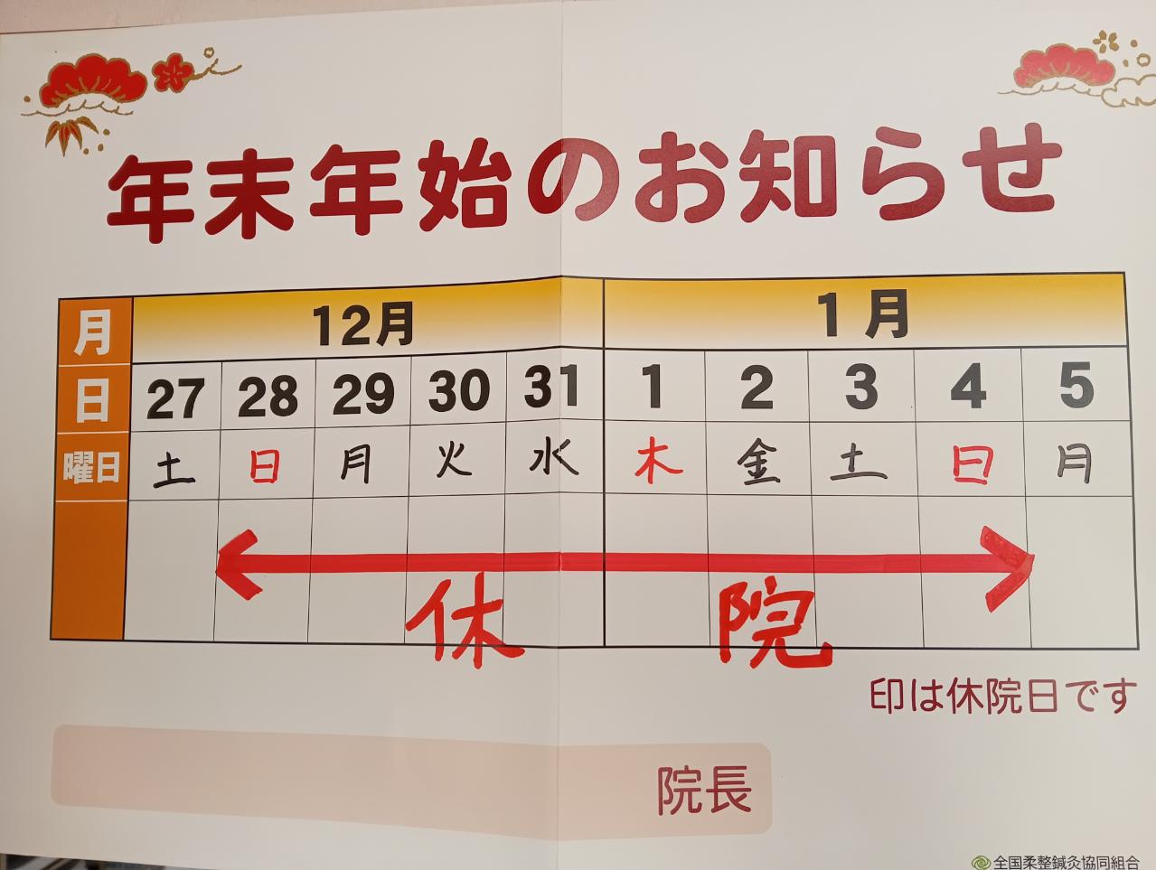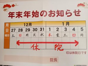 12月28日(日)から1月4日(日)まで休診となります。